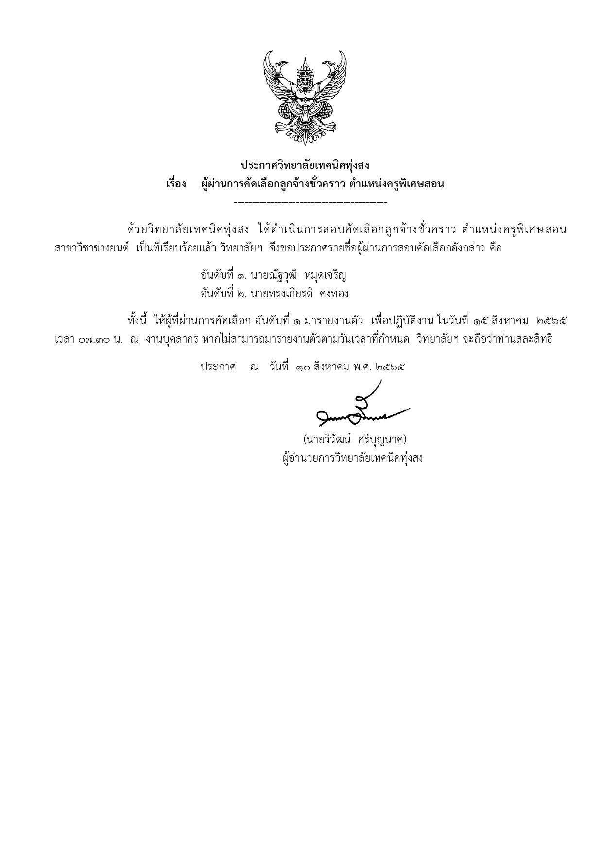 ประกาศ เรื่อง ผู้ผ่านการคัดเลือกลูกจ้างชั่วคราว ตำแหน่งครูพิเศษสอน สาขาวิชาช่างยนต์
